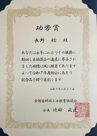 本会副会長の長野 稔氏が全国歯科技工士教育協議会の功労賞を受賞!