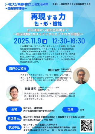歯科技工士はもちろん、診療サイドに立つ歯科医師、歯科衛生士などの歯科関係者には是非ともご参加いただきたい研修です。