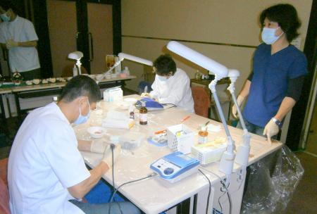 2つの施設から10名、20床の申し込みがあり、技工士会から5名の会員が参加して義歯に名前入れを行いました。