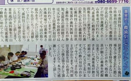 11月15日号の地元新聞日田市版で、先月10月31日に日田玖珠支部が行いました特別養護老人ホーム「喜楽苑」での義歯ネーム入れボランティア活動が記事掲載されました。